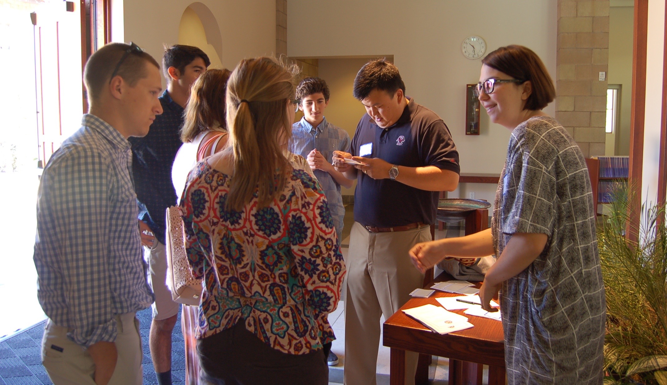 - Lissa Tsu ’00, right, and husband/classmate Brian, second from right, check in arrivals.