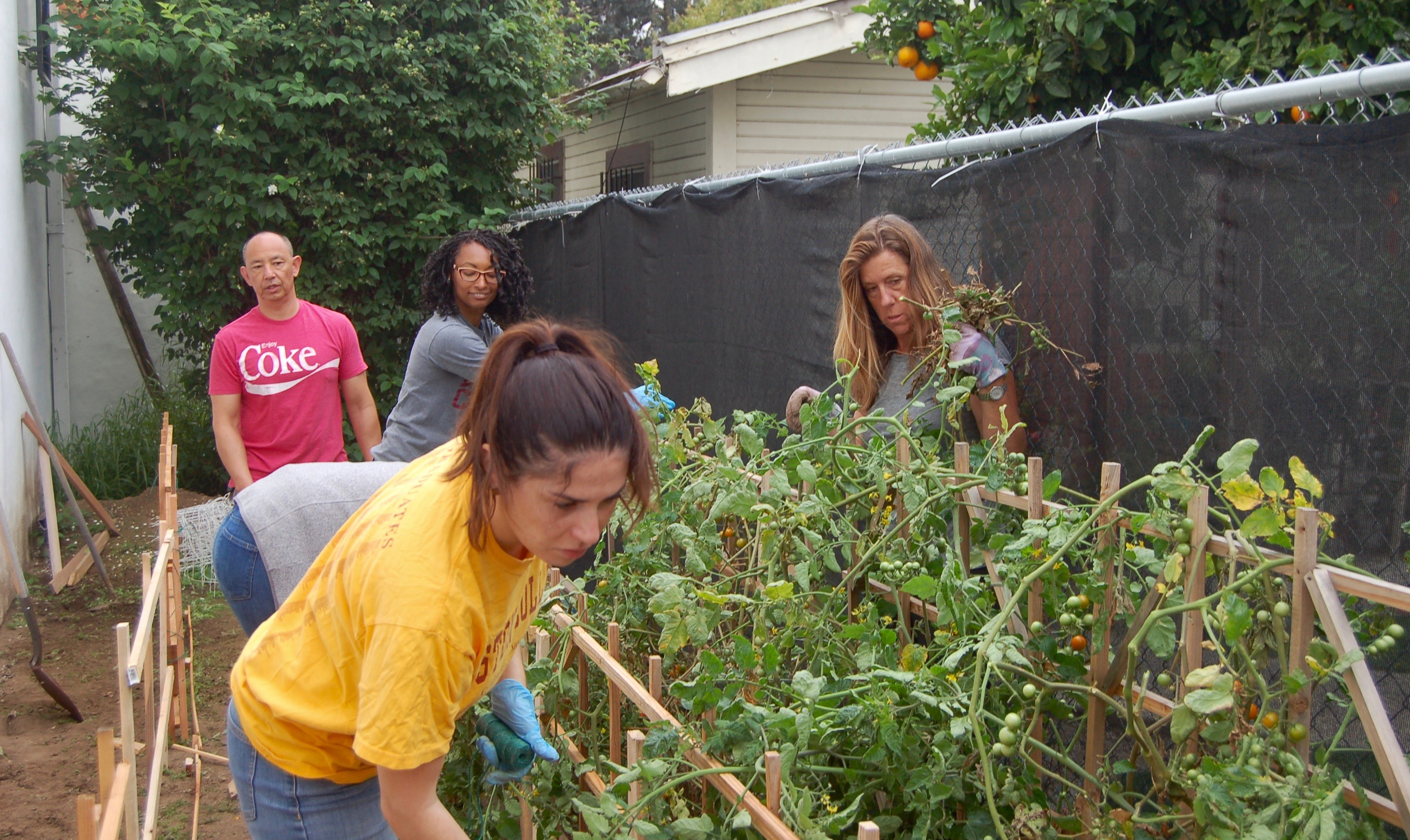 BCSD started the morning repotting Birds of Paradise and placing them outside classrooms facing out into the playground. We moved on to clear weeds, install lattices, and build a gravel walkway in the small garden area that features tomatoes. Finally, we touched up paint along the exterior of the school. Below is a photo gallery of the activities.