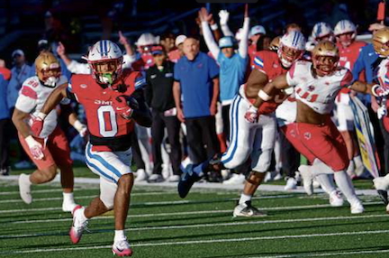 The Mustangs tacked on two more touchdowns in the third quarter on long touchdown passes to lead 31-6 and pushed it to 38-6 early in the final quarter. The Eagles scored their only touchdown with 8:59 left in the game on a five-yard Lonergan pass to RB Jordan McDonald. SMU closed out the scoring with a 48-yard TD run (photo above).